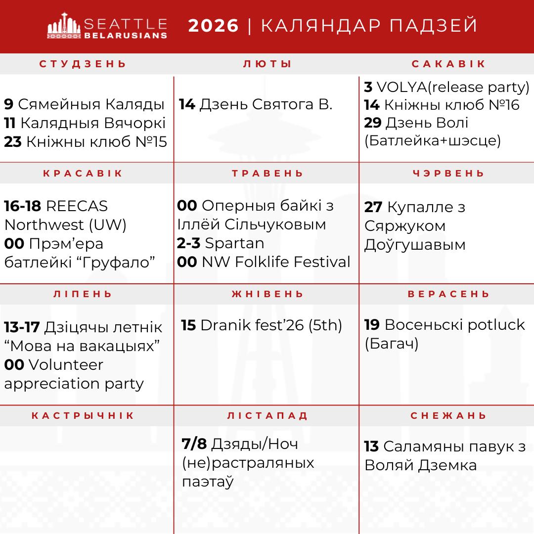 Вашай увазе прыкладны каляндар падзей на канец 2026 года. Сачыце за нашым сайтам і сацыяльнымі сеткамі (прызнаныя экстрэмісцкімі ў РБ), альбо падпішыцеся на каляндар падзей, каб не прапусціць нічога цікавага.